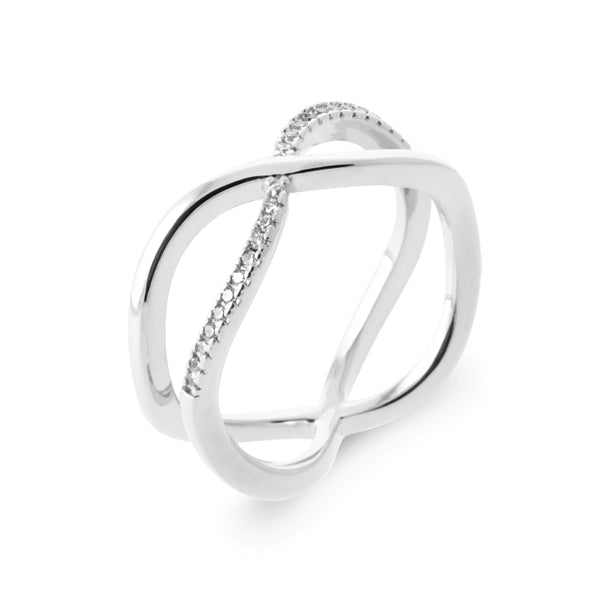 Bague en argent 925 rhodié* composée de deux anneaux ondulés croisés en leur centre. Un des anneaux est agrémenté de zirconiums.